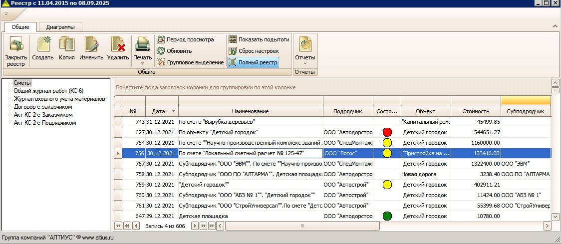 - ведение реестра актов выполненных работ с заказчиками и подрядчиками с одновременным контролем сроков выполнения;